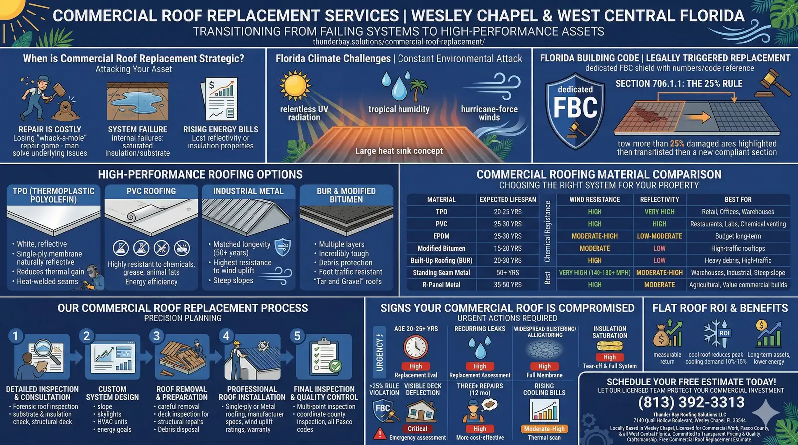 Thunder Bay Roofing Solutions LLC provides professional commercial roof replacement services to business owners and property managers across Wesley Chapel and the greater West Central Florida region. Our service area includes Pasco County, Hillsborough County, Pinellas County, Wesley Chapel, New Tampa, Pebble Creek, Meadow Pointe, Hunters Green, Tampa Palms, Lutz, Land O’ Lakes, Odessa, Carrollwood, Lake Magdalene, Northdale, Citrus Park, Temple Terrace, Oldsmar, Brandon, Bloomingdale East / West, Sarasota, Bradenton, Fort Myers, and Orlando. Explore our complete list of coverage zones on our Service Areas page.