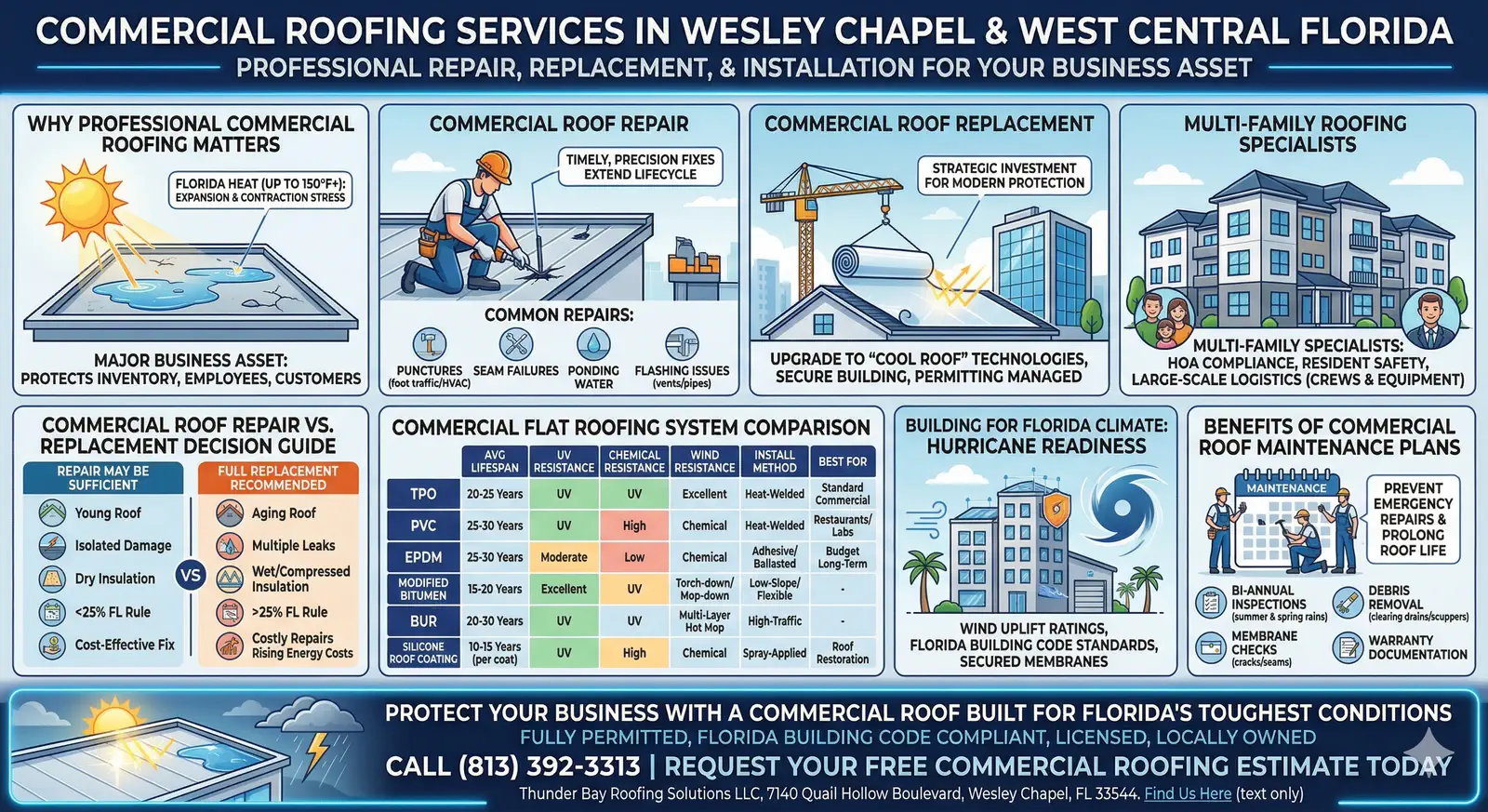 A failing commercial roof is not just a maintenance issue, it is a direct threat to your operations, inventory, tenants, and bottom line. Thunder Bay Roofing Solutions LLC delivers commercial roofing solutions across Wesley Chapel and West Central Florida that are fully permitted, Florida Building Code compliant, and installed with the efficiency your business demands.
