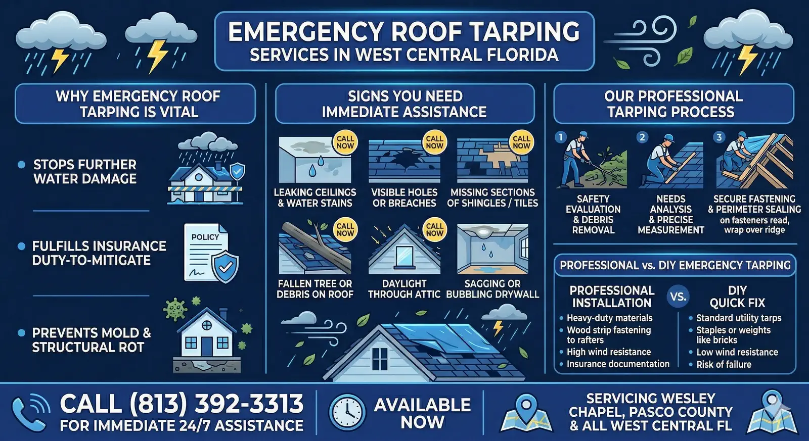 After a storm moves through Pasco County, the window between initial roof damage and serious interior water damage can be measured in hours, not days. The table below helps Wesley Chapel and West Central Florida homeowners identify the specific warning signs that mean emergency roof tarping is needed right now, before the next rain event makes the situation significantly worse.