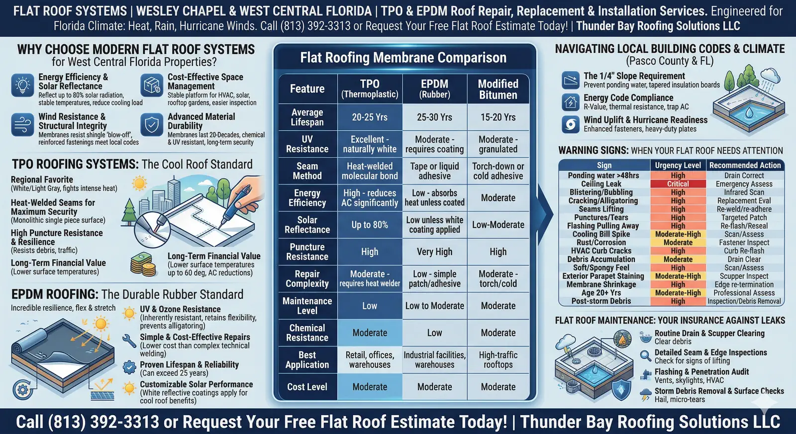 Florida’s combination of intense UV radiation, heavy seasonal rainfall, and hurricane-force winds creates very specific flat roofing failure patterns that worsen rapidly without professional intervention. The table below helps Wesley Chapel and West Central Florida property owners identify exactly when to call Thunder Bay Roofing Solutions LLC, before a manageable issue escalates into a full membrane replacement.