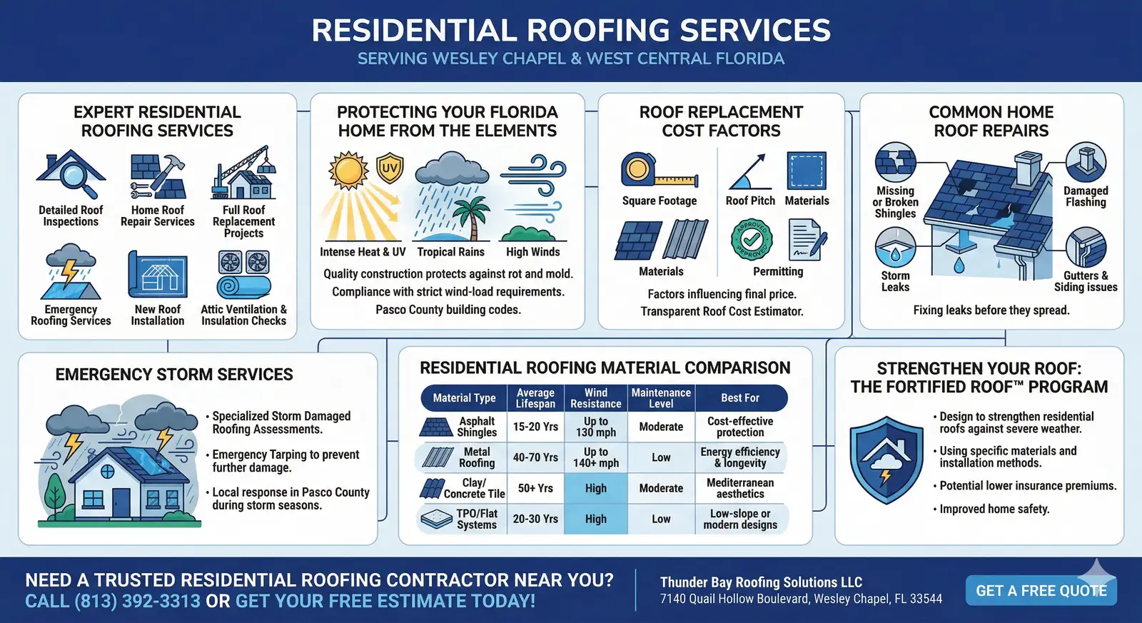Explore the quality of our residential roofing work across Wesley Chapel and the Tampa Bay area by browsing our Project Gallery, and discover why homeowners throughout Pasco and Hillsborough counties trust Thunder Bay Roofing Solutions LLC for every roof replacement and repair by reading our Customer Testimonials.