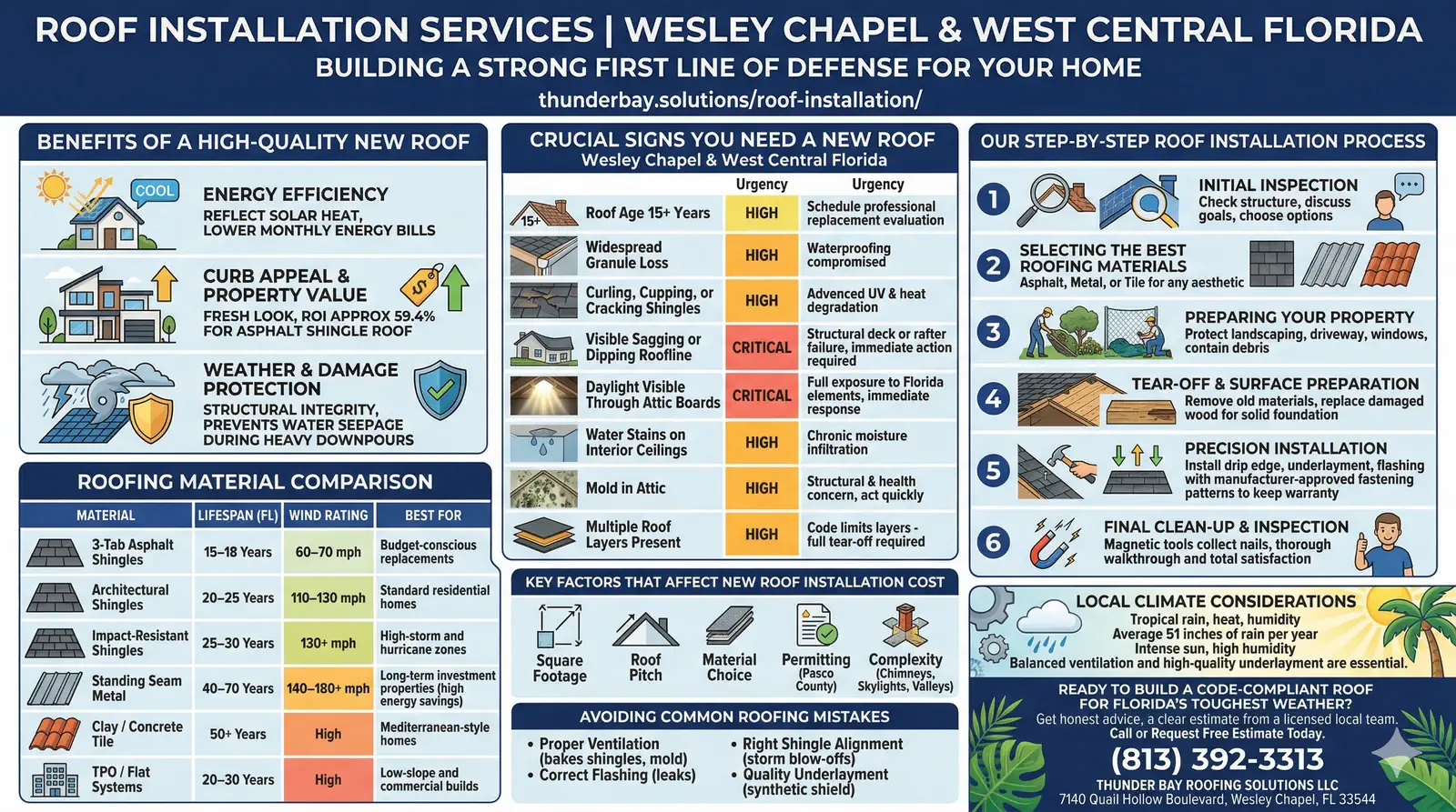 - Permanently Local: We are not storm chasers who move on after the job. Thunder Bay Roofing Solutions LLC is based at 7140 Quail Hollow Boulevard in Wesley Chapel, we are here before, during, and long after your installation is complete.