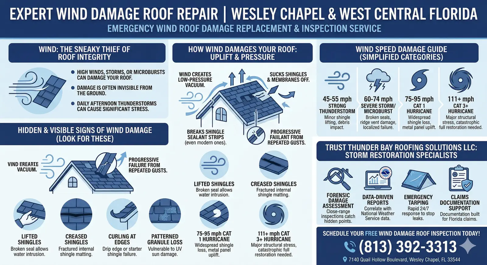 Thunder Bay Roofing Solutions LLC provides fast, professional wind damage roof repair and replacement services to homeowners and property owners across Wesley Chapel and the greater West Central Florida region. Our service area includes Pasco County, Hillsborough County, Pinellas County, Wesley Chapel, New Tampa, Pebble Creek, Meadow Pointe, Hunters Green, Tampa Palms, Lutz, Land O’ Lakes, Odessa, Carrollwood, Lake Magdalene, Northdale, Citrus Park, Temple Terrace, Oldsmar, Brandon, Bloomingdale East / West, Sarasota, Bradenton, Fort Myers, and Orlando. Explore our complete list of coverage zones on our Service Areas page.